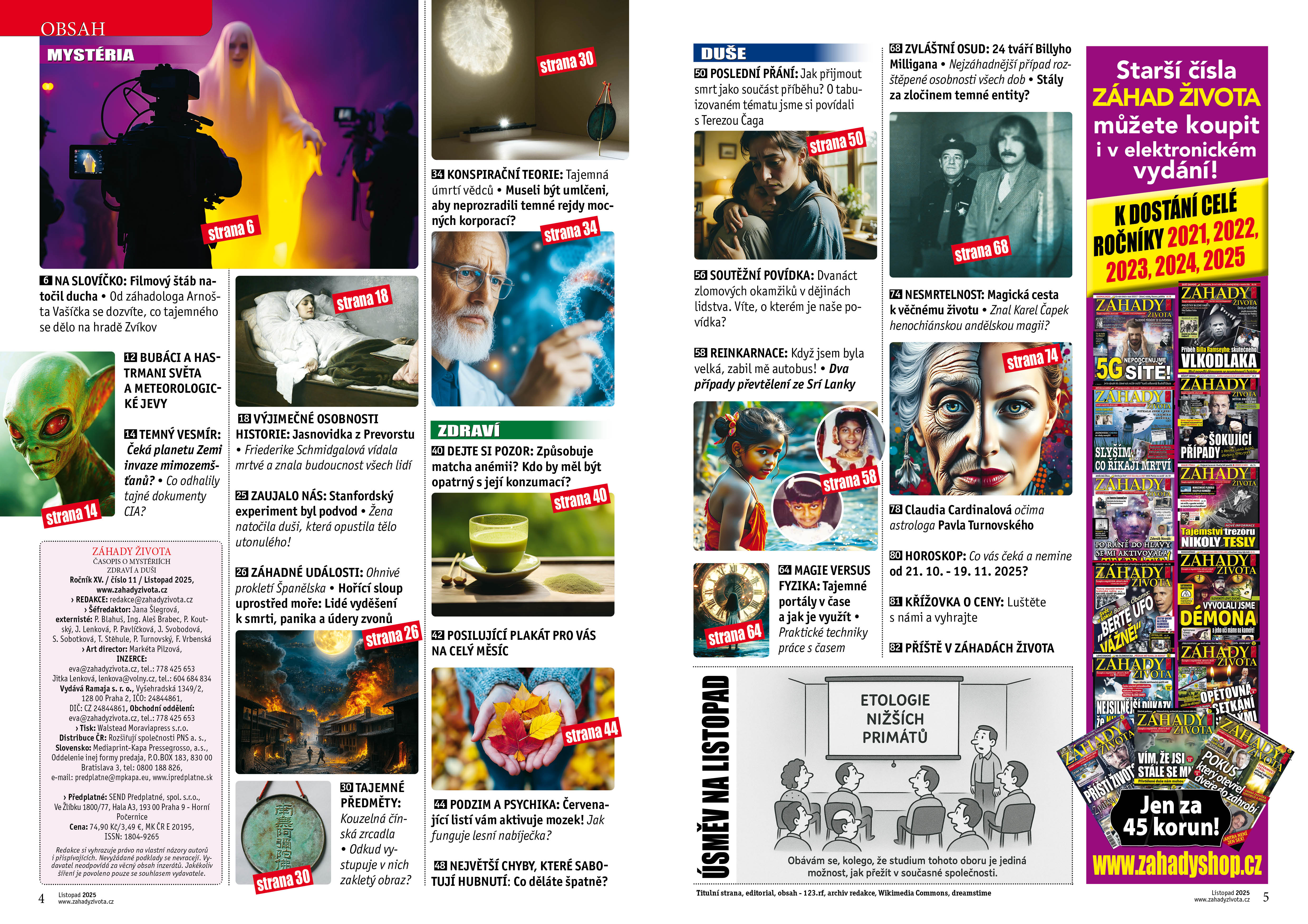Filmový štáb natočil ducha: Od záhadologa Arnošta Vašíčka se dozvíte, co tajemného se dělo na hradě Zvíkov / Čeká planetu Zemi invaze mimozemšťanů? Co odhalily tajné dokumenty CIA? / Jasnovidka z Prevorstu: Friederike Schmidgalová vídala mrtvé a znala budoucnost všech lidí / Jak přijmout smrt jako součást příběhu? O tabuizovaném tématu jsme si povídali s Terezou Čaga / Reinkarnace: Když jsem byla velká, zabil mě autobus! Dva případy převtělení ze Srí Lanky a mnoho dalšího